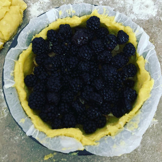 Stendere la frolla, bucherellare con la forchetta il fondo, aggiungere i biscotti secchi frullati e le more, ricoprire con la rimanente frolla.